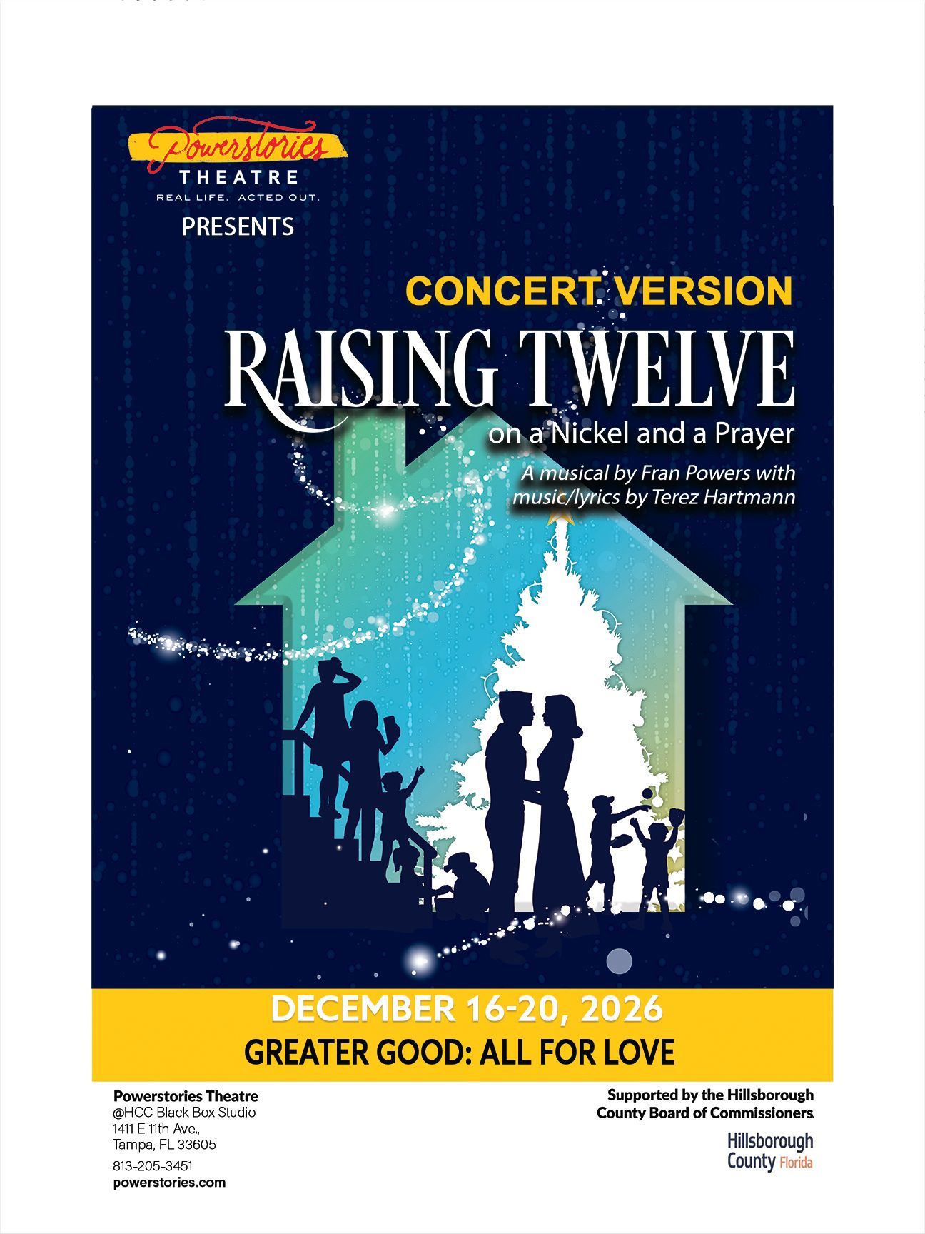 Raising Twelve on a Nickel and a Prayer is an original musical spanning three Christmas seasons, from 1950 to 1966. It follows the love story, adventures, and trials and tribulations of Betty, who dreams of having 12 children, and Harold, her husband, a Navy sailor. This performance is presented in a concert version.